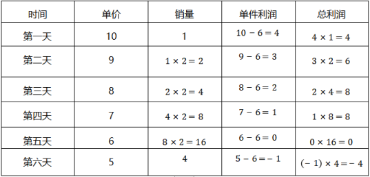 賦值該商品的原價為10元,第一天的銷量為1件。根據(jù)題意,每天單價下降10*10%=1元;每天的銷量變?yōu)榍耙惶斓?倍;“成本為原價的60%”,則每件的成本為10*60%=6元。根據(jù)題意可得表格如下: