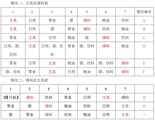 【答案】C【解析】根據(jù)題干的條件排除即可。A.文具和調(diào)料中間不是間隔3;B.酒類不在調(diào)料前面;D.零食和糧油中間不相隔2個(gè)。