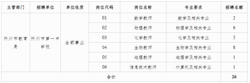 按照事業(yè)單位公開(kāi)招聘工作人員有關(guān)文件規(guī)定,根據(jù)增人計(jì)劃和招聘單位編制、崗位空缺及教師隊(duì)伍結(jié)構(gòu)情況,經(jīng)市委、市政府同意,通過(guò)校園招聘方式,面向全國(guó)本科院校2024年本科及以上學(xué)歷學(xué)位應(yīng)屆畢業(yè)生(含公費(fèi)師范生,不含定向及委培生),為忻州市第一中學(xué)校招聘教師26名,現(xiàn)公告如下: