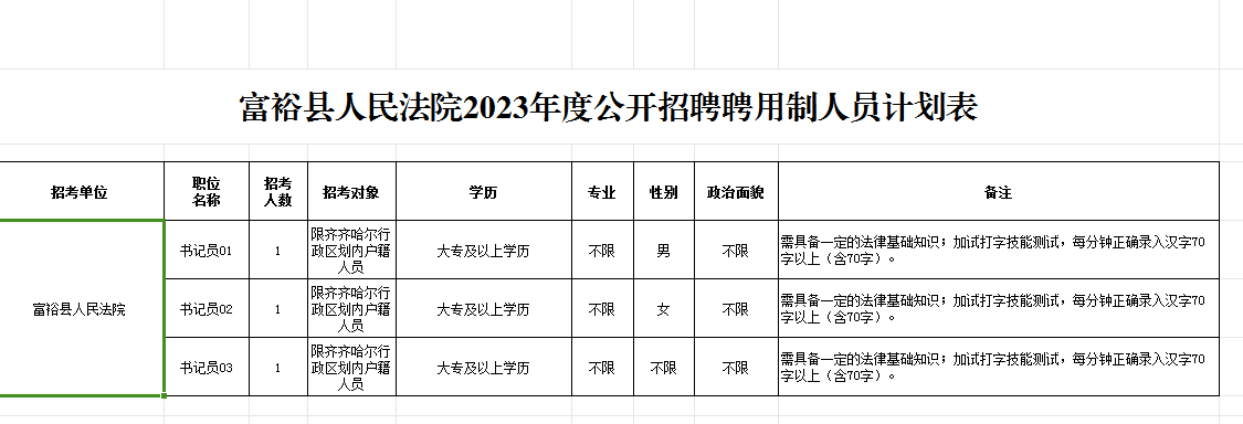 (八)限齊齊哈爾行政區(qū)劃內(nèi)戶籍人員報(bào)考(詳見附件1:《富裕法院2023年公開招聘聘用制人員計(jì)劃表》)。