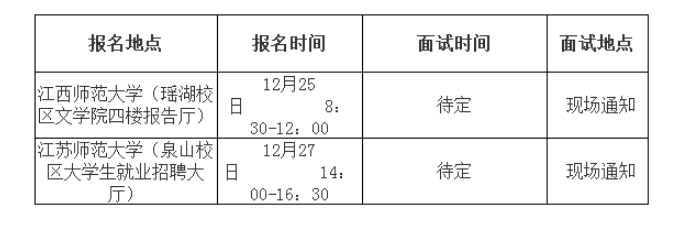本次招聘在江西師范大學(xué)(瑤湖校區(qū))、江蘇師范大學(xué)(泉山校區(qū))等地設(shè)招聘點,采取現(xiàn)場報名的方式。