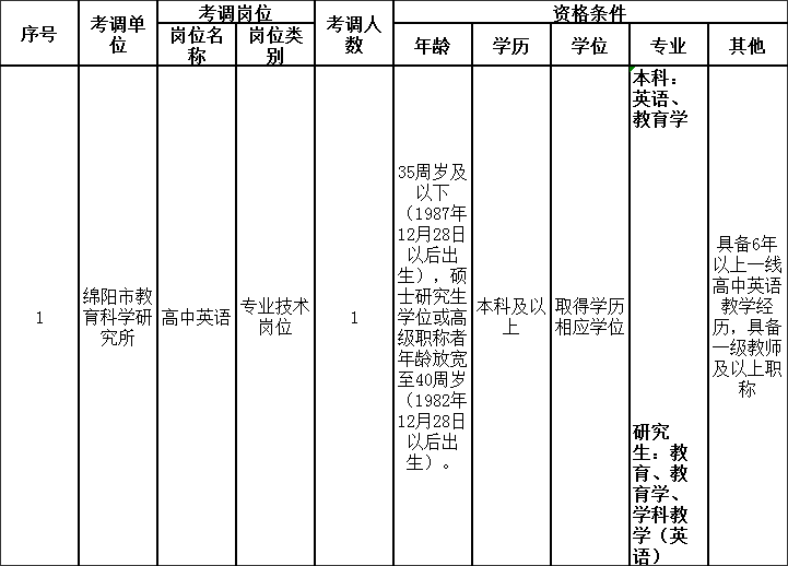 附件1.綿陽市教育科學(xué)研究所公開考調(diào)專業(yè)技術(shù)人員崗位和條件一覽表