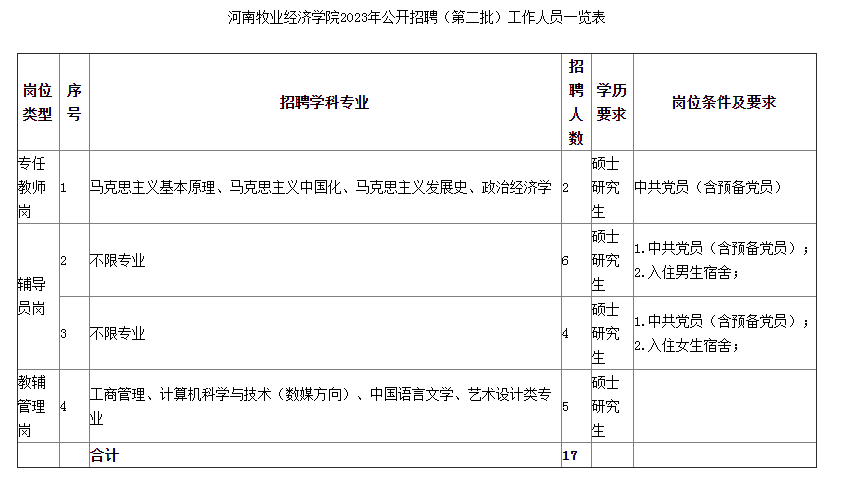 7.崗位所需的專業(yè)和其他條件(詳見附件《河南牧業(yè)經(jīng)濟學院2023年公開招聘(第二批)工作人員一覽表》)。