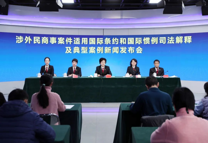 2023年12月28日,最高人民法院舉行涉外民商事案件適用國(guó)際條約和國(guó)際慣例司法解釋及典型案例新聞發(fā)布會(huì)。最高人民法院審判委員會(huì)副部級(jí)專職委員王淑梅、最高人民法院民四庭庭長(zhǎng)沈紅雨、最高人民法院民四庭副庭長(zhǎng)胡方和最高人民法院民四庭二級(jí)高級(jí)法官楊興業(yè)出席發(fā)布會(huì),發(fā)布《最高人民法院關(guān)于審理涉外民商事案件適用國(guó)際條約和國(guó)際慣例若干問(wèn)題的解釋》、涉外民商事案件適用國(guó)際條約和國(guó)際慣例典型案例,并回答記者提問(wèn),發(fā)布會(huì)由最高人民法院新聞局副局長(zhǎng)王斌主持。