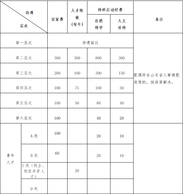 (一)各類引進(jìn)人才除享受國(guó)家及學(xué)校規(guī)定的基本工資待遇外,學(xué)校在安家費(fèi)、科研啟動(dòng)經(jīng)費(fèi)等方面提供以下待遇。(人民幣,單位:萬(wàn)元)