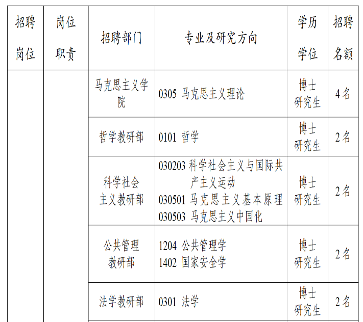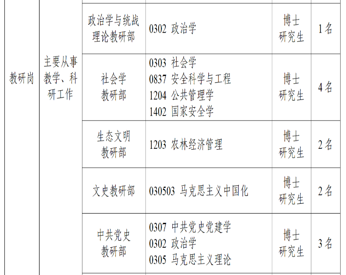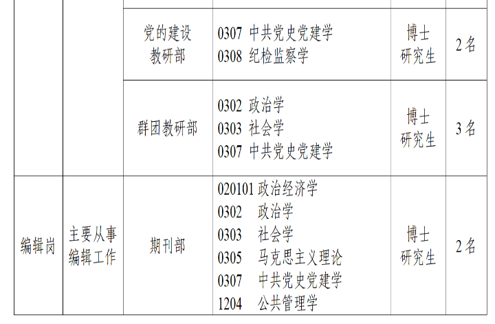 為進一步加強校(院、室)人才隊伍建設,根據(jù)教學科研和學科建設需要,按照《天津市事業(yè)單位公開招聘人員實施辦法(試行)》(津人社局發(fā)〔2011〕10號)、《市委組織部市人力社保局關于進一步完善事業(yè)單位公開招聘工作的通知》(津人社局發(fā)〔2017〕37號)和《市委組織部市人力社保局關于進一步做好事業(yè)單位公開招聘高校畢業(yè)生等有關工作的通知》(津人社辦發(fā)〔2020〕100號),2024年,中共天津市委黨校(天津行政學院、中共天津市委黨史研究室)擬面向全國公開招聘31名博士研究生人員。現(xiàn)公告如下:
