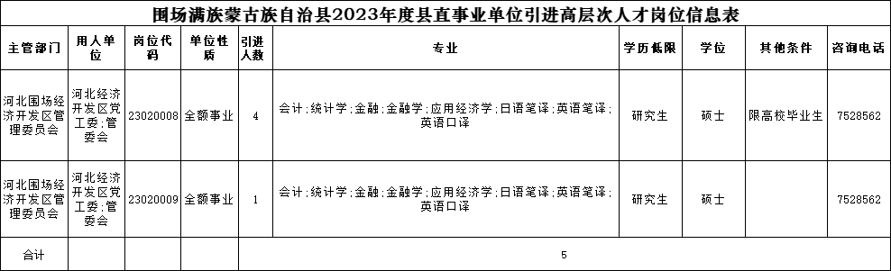 為河北圍場(chǎng)經(jīng)濟(jì)開發(fā)區(qū)管理委員會(huì)引進(jìn)碩士研究生及以上高層次人才5名(全額事業(yè)編制)。具體招聘崗位、人數(shù)、條件等詳情見《承德市圍場(chǎng)縣2023年縣直事業(yè)單位引進(jìn)碩士研究生以上高層次人才崗位信息表》(附件)。