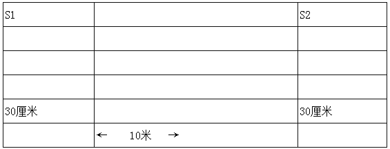 測試方法為:受測者用站立式起跑,聽到發(fā)令后從S1線外起跑,當(dāng)跑到S2線前面,用一只手拿起一木塊隨即往回跑,跑到S1線前時(shí)交換木塊,再跑回S2交換另一木塊,最后持木塊沖出S1線,記錄跑完全程的時(shí)間。記錄以秒為單位,取一位小數(shù),第二位小數(shù)非“0”時(shí)則進(jìn)1。
