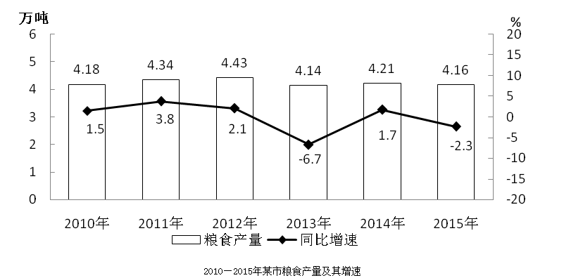 例題:某市2015年全年糧食總產(chǎn)量4.16萬噸,同比下降2.3%;甘蔗產(chǎn)量0.57萬噸,下降23.6%;油料產(chǎn)量0.12萬噸,增長32.4%;蔬菜產(chǎn)量15.79萬噸,下降3.4%;水果產(chǎn)量7.84萬噸,增長7.4%。