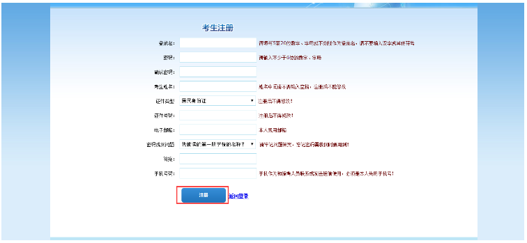 點(diǎn)擊“注冊(cè)”按鈕,進(jìn)入考生注冊(cè)頁面,如下圖所示: