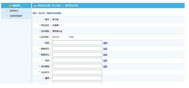 通過點(diǎn)擊接受按鈕,進(jìn)入考生填寫報(bào)名信息的頁面,如下圖所示: