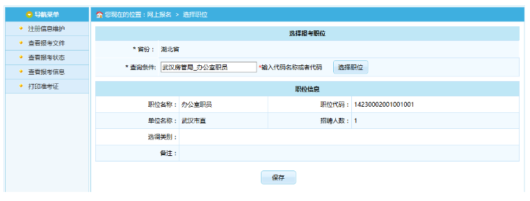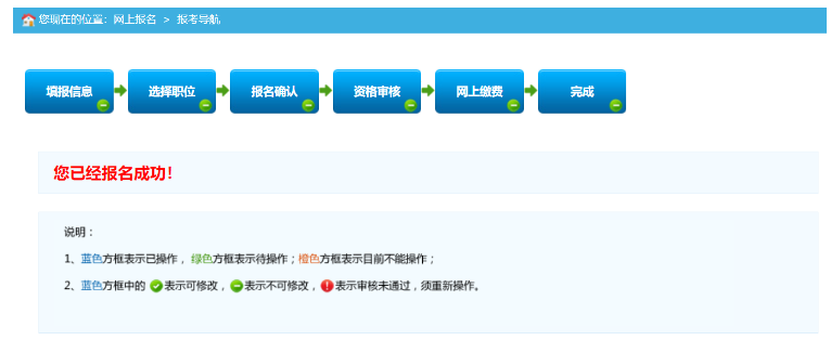 選擇相應(yīng)的職位,點(diǎn)擊“保存”按鈕,提示保存成功,可以跳轉(zhuǎn)到報(bào)考流程頁面,如下圖所示: