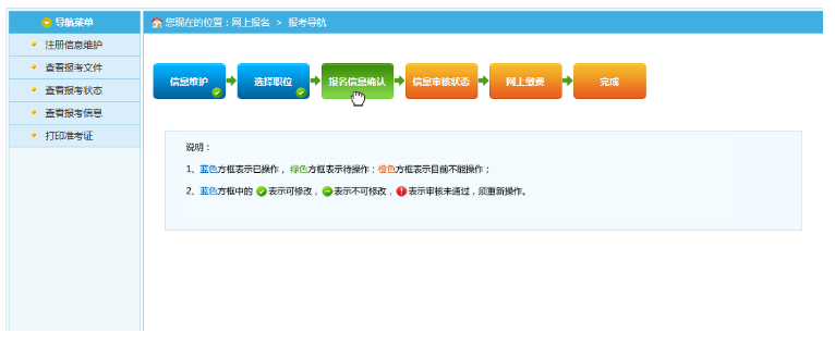 通過點(diǎn)擊“確認(rèn)”按鈕,提示確認(rèn)成功后跳轉(zhuǎn)到報(bào)考流程頁面。進(jìn)入審核狀態(tài),等待審核員進(jìn)行資格審核。