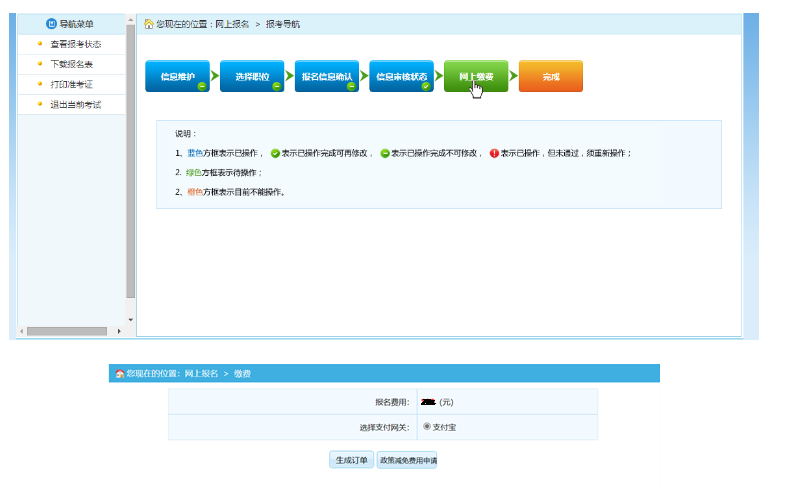 審核通過的考生可以進(jìn)行網(wǎng)上繳費(fèi),點(diǎn)擊報(bào)考流程中“網(wǎng)上繳費(fèi)”選項(xiàng),可以進(jìn)入網(wǎng)上繳費(fèi)的頁面,如下圖所示:
