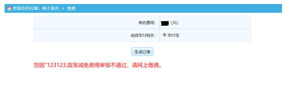 “網(wǎng)上繳費(fèi)”界面提示“您因XXXX政策減免費(fèi)用審核不通過,請(qǐng)網(wǎng)上繳費(fèi)”時(shí),需重新生成訂單,進(jìn)行網(wǎng)上繳費(fèi)。