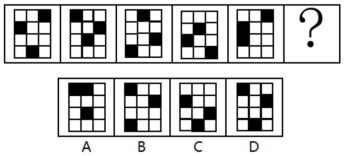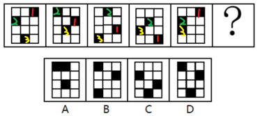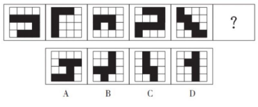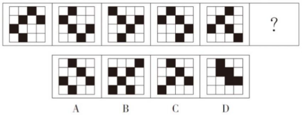 【答案】C【解析】題干圖形均含有一定數(shù)量的黑色方塊,黑色方塊在移動(dòng)方面不存在規(guī)律,此時(shí)可以考慮黑色方塊的數(shù)量以及黑色方塊之間的連接方式。題干圖形中均含有5個(gè)黑色方塊,由此可排除B;題干圖形中的黑色方塊均以點(diǎn)連接為一個(gè)整體,由此可排除A、D。故本題選C。