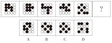 【答案】B【解析】本題為黑白塊題型,圖形整體沒有規(guī)律,觀察所有圖形黑塊數(shù)量沒有變化,只有位置發(fā)生改變,考慮移動(dòng)。移動(dòng)規(guī)律如下: