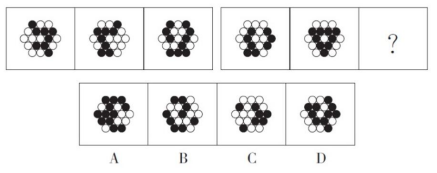 【答案】B【解析】觀察發(fā)現(xiàn),題干圖形均由黑圓和白圓組成,但根據(jù)二者之間的數(shù)量關(guān)系無法確定答案,圖形之間的位置性、對稱性等方面也不存在明顯規(guī)律;再次觀察發(fā)現(xiàn),從第二個(gè)圖形開始,白圓都被黑圓分割為若干部分,可以考慮白圓的部分?jǐn)?shù)規(guī)律。題干圖形中白圓的部分?jǐn)?shù)依次為1、2、3、4、5、(6),只有B項(xiàng)中白圓的部分?jǐn)?shù)為6。故本題選B。
