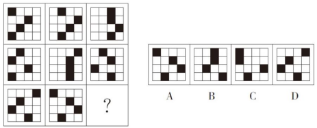 【答案】A【解析】本題為黑白塊題型,圖中黑白塊數(shù)量不同,但整體較為規(guī)整,優(yōu)先整體考慮。整體圖形呈軸對稱,且對稱軸分別為“/”、“|”、“”、“—”、“/”,對稱軸依次逆時(shí)針旋轉(zhuǎn)45°,所以“?”處的對稱軸應(yīng)該為“|”。對比選項(xiàng):