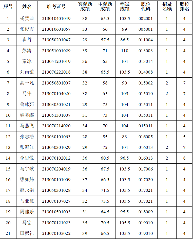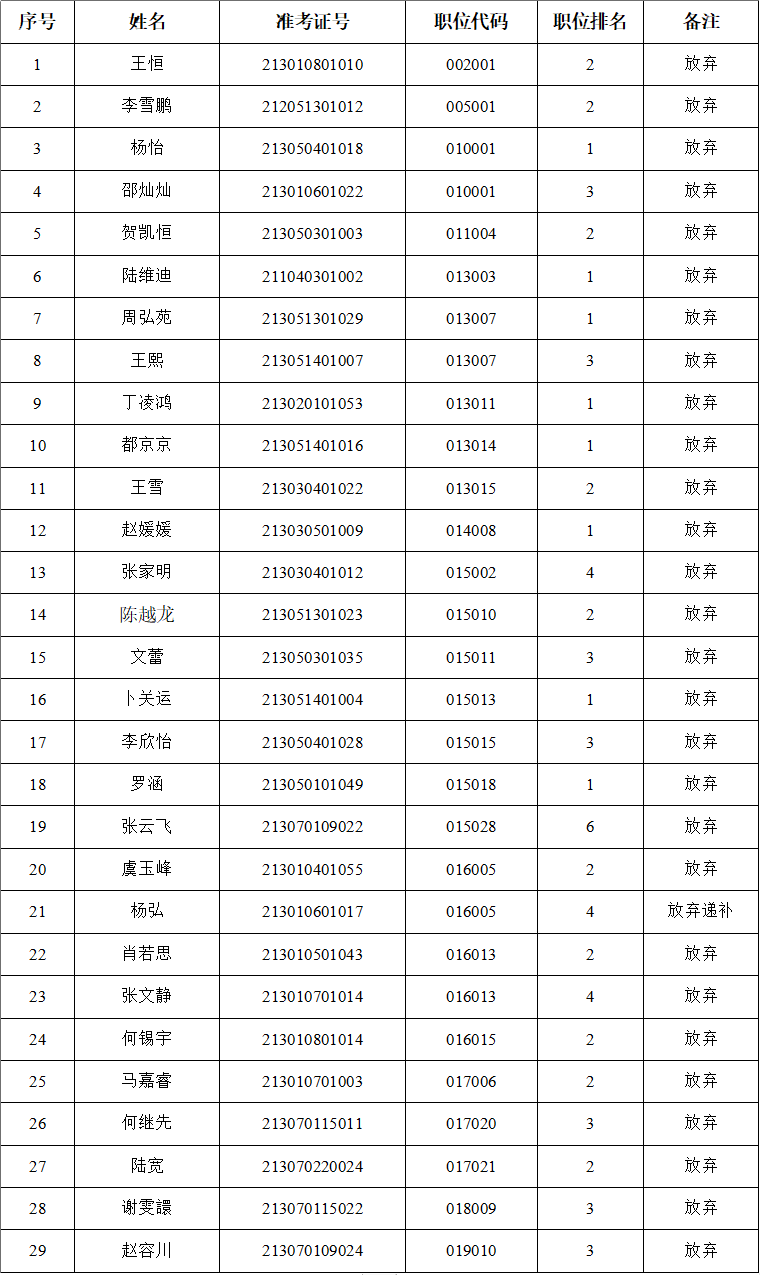 2024年寧夏招錄選調(diào)生面試人員名單發(fā)布后,有考生自愿放棄面試資格。根據(jù)《2024年寧夏招錄選調(diào)生公告》及相關(guān)規(guī)定,面試空缺名額由報考同一職位且筆試成績在合格分數(shù)線以上的考生從高分到低分依次遞補?,F(xiàn)將自愿放棄面試資格考生與遞補進入面試考生名單公示如下: