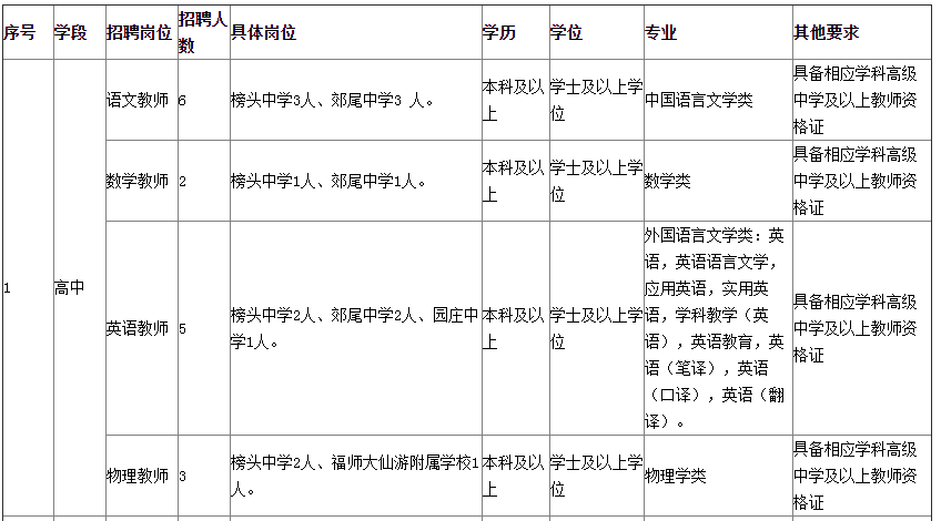仙游縣第一輪公開(kāi)招聘2024年新任中學(xué)教師工作于2024年1月6日完成,仍有39個(gè)招考崗位無(wú)人報(bào)名或者未達(dá)到開(kāi)考比例,為深入實(shí)施人才強(qiáng)縣戰(zhàn)略,提高教師隊(duì)伍整體素質(zhì),推進(jìn)教育事業(yè)發(fā)展,結(jié)合我縣人才發(fā)展需要和學(xué)校學(xué)科緊缺需要,擬第二輪專項(xiàng)招聘仙游縣2024年中學(xué)新任教師39名(詳見(jiàn)招聘崗位表),具體方案如下:
