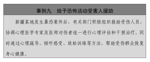 ??——保障受害人和其他利害關(guān)系人的權(quán)利。中國(guó)在應(yīng)對(duì)處置恐怖事件時(shí),優(yōu)先保護(hù)直接受到恐怖活動(dòng)危害、威脅人員的人身安全,組織營(yíng)救和救治受害人員,疏散、撤離并妥善安置受到威脅的人員;應(yīng)對(duì)處置結(jié)束后,組織有關(guān)部門幫助受影響的單位和個(gè)人盡快恢復(fù)生活、生產(chǎn),穩(wěn)定受影響地區(qū)的社會(huì)秩序和公眾情緒,及時(shí)給予恐怖事件受害人員及其近親屬適當(dāng)?shù)木戎峁┬睦?、醫(yī)療等方面的援助,并向失去基本生活條件的受害人員及其近親屬及時(shí)提供基本生活保障。