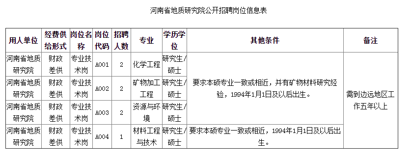 6. 具備應(yīng)聘崗位所需要的其他具體條件,詳見《河南省地質(zhì)研究院公開招聘崗位信息表》(附件)。