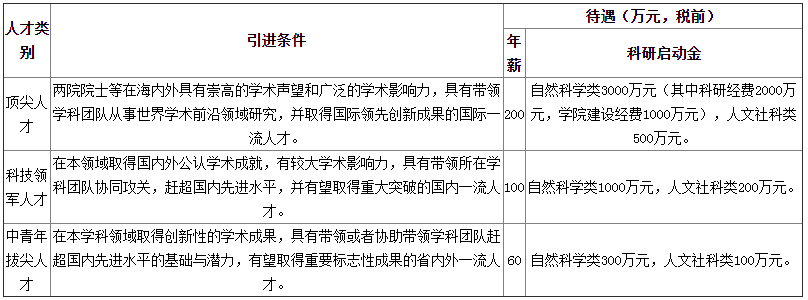 引進的高層次人才分為三個類別,分別是頂尖人才、科技領軍人才和中青年拔尖人才。具體引進范圍如下,待遇不低于以下標準: