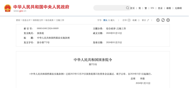 1月25日,國務院網(wǎng)站公布《中華人民共和國檔案法實施條例》,自2024年3月1日起施行。