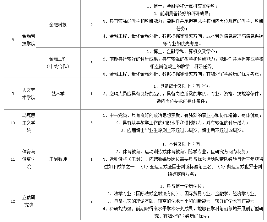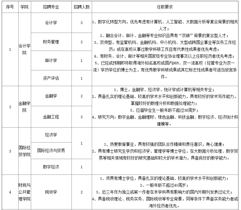 常任軌教師:為學校高層次人才的預備培育“蓄水池”,面向海內外優(yōu)秀青年才俊,專業(yè)為會計學、審計學、公司金融、數字金融、金融理財、綠色金融、國別金融、科技金融、宏觀經濟、區(qū)域經濟、數字經濟、經濟統(tǒng)計和建模等專業(yè),薪資待遇面議。