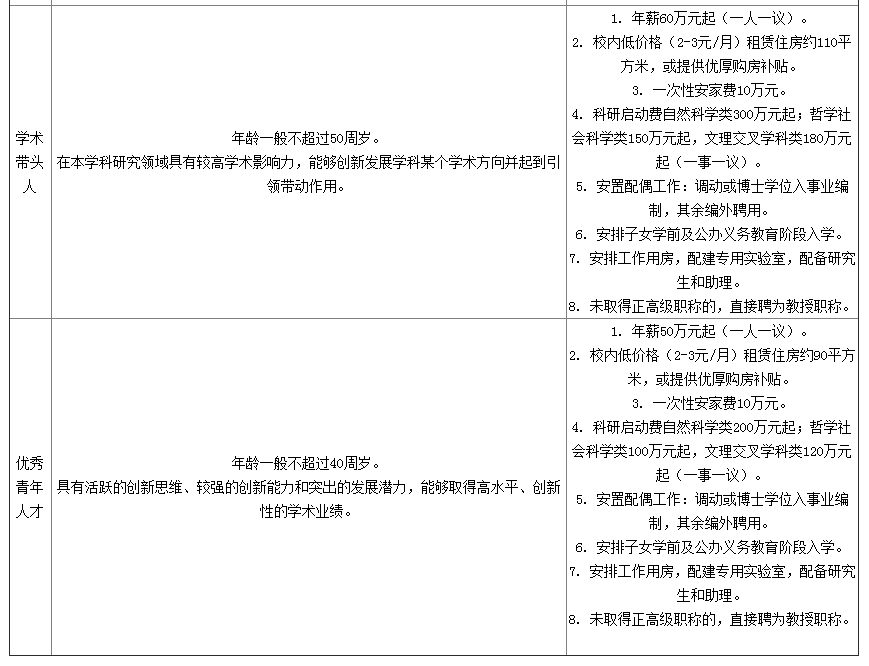 ?。?)C層次人才:生活補(bǔ)助每年20萬(wàn)元,連續(xù)發(fā)放5年;一次性購(gòu)房補(bǔ)助100萬(wàn)元;科研補(bǔ)助每年自然科學(xué)類60萬(wàn)元、哲學(xué)社會(huì)科學(xué)類20萬(wàn)元,連續(xù)補(bǔ)助5年。