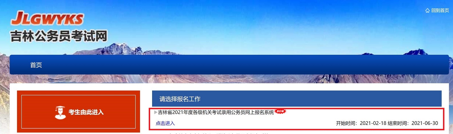 1、報(bào)名考生進(jìn)入該網(wǎng)站后,點(diǎn)擊頁面右上角紅色的‘考生由此進(jìn)入’,進(jìn)入報(bào)名工作選擇界面,如圖1-1:
