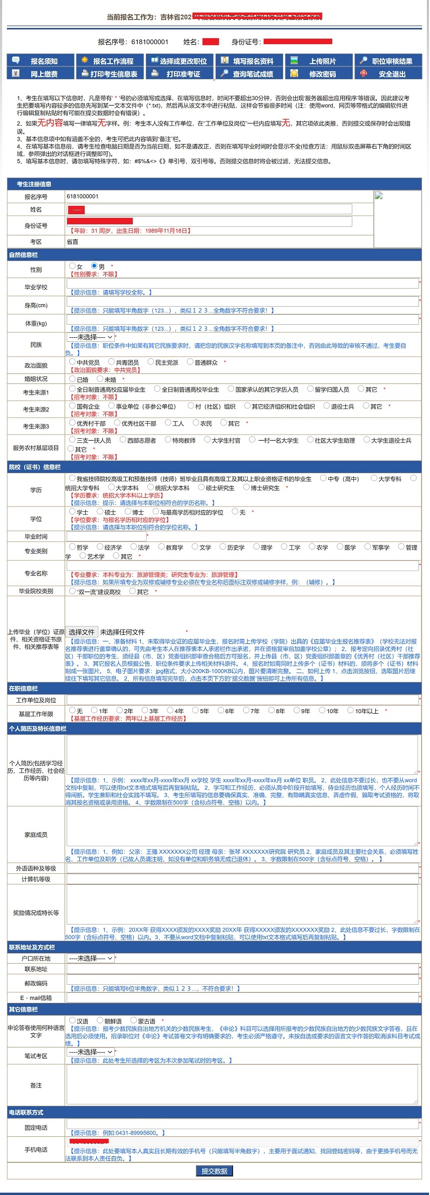 點(diǎn)擊圖3-1中‘報(bào)名資料填寫’按鈕會(huì)顯示如圖3-2頁面,考生填寫相應(yīng)的信息,帶有‘*’字樣的為必填項(xiàng),填寫完畢后點(diǎn)擊‘提交數(shù)據(jù)’即可。