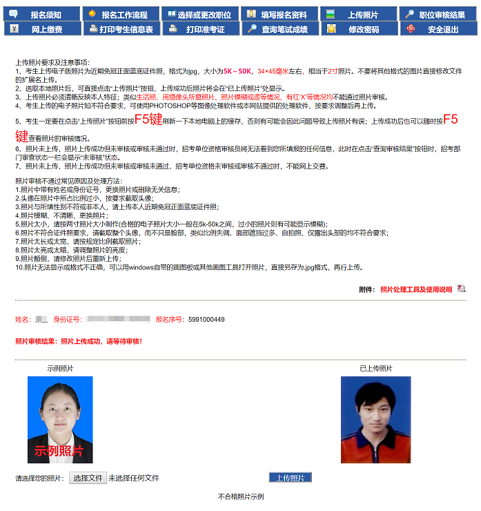 4、點(diǎn)擊‘上傳照片’按鈕,顯示‘已上傳照片,未審核,請(qǐng)等待審核!’如圖4-4,查看照片是否通過,可在圖4-4的頁面進(jìn)行查看??忌牲c(diǎn)擊“不合格照片示例”按鈕查看不符合要求的照片(僅做示例)。