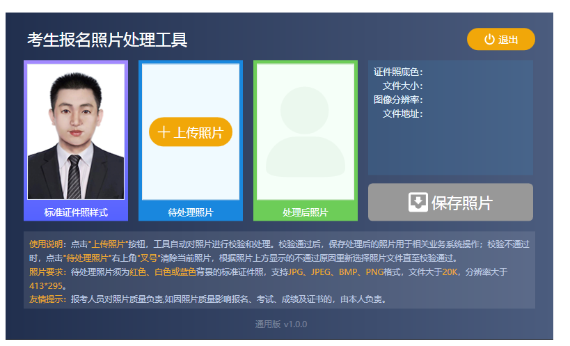1.照片要求:待處理照片須為紅色、白色或藍(lán)色背景的標(biāo)準(zhǔn)證件照,支持JPG、JPEG、BMP、PNG格式,文件大于20K,分辨率大于413*295。
