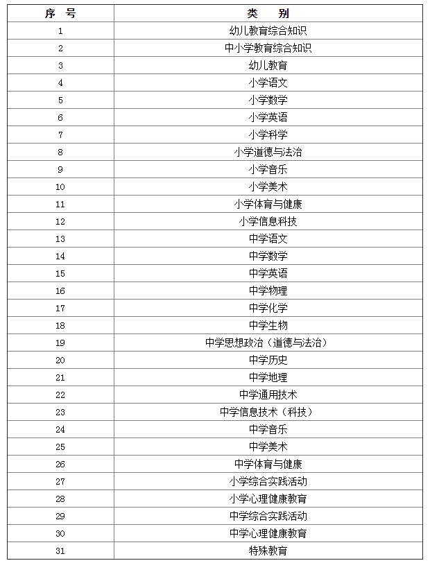 筆試科目:“教育綜合知識(shí)”和“專(zhuān)業(yè)知識(shí)”??颇款?lèi)別共設(shè)31個(gè)(參見(jiàn)附件),由應(yīng)聘者根據(jù)本人所報(bào)考崗位類(lèi)別選擇其中一個(gè)科目類(lèi)別參加考試;“教育綜合知識(shí)”是每位應(yīng)聘者必考科目。