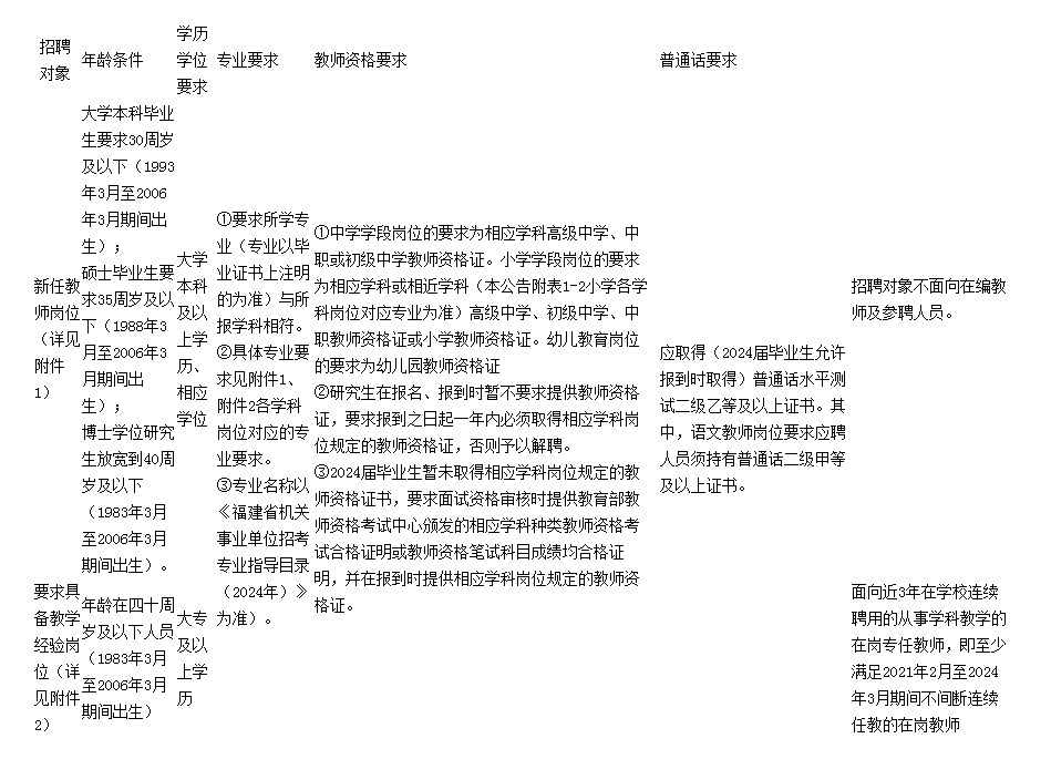 5.專業(yè)條件設(shè)置為“××類”的招聘崗位,符合《福建省機(jī)關(guān)事業(yè)單位招考專業(yè)指導(dǎo)目錄(2024年》中“××類”所列專業(yè)的報(bào)考者準(zhǔn)予報(bào)考;專業(yè)條件設(shè)置為具體專業(yè)名稱的招聘崗位,符合所列專業(yè)(詳見(jiàn)本公告附表1、附表2、附表3崗位)的報(bào)考者準(zhǔn)予報(bào)考。對(duì)博士和留學(xué)人員的專業(yè)要求按相近原則認(rèn)定。