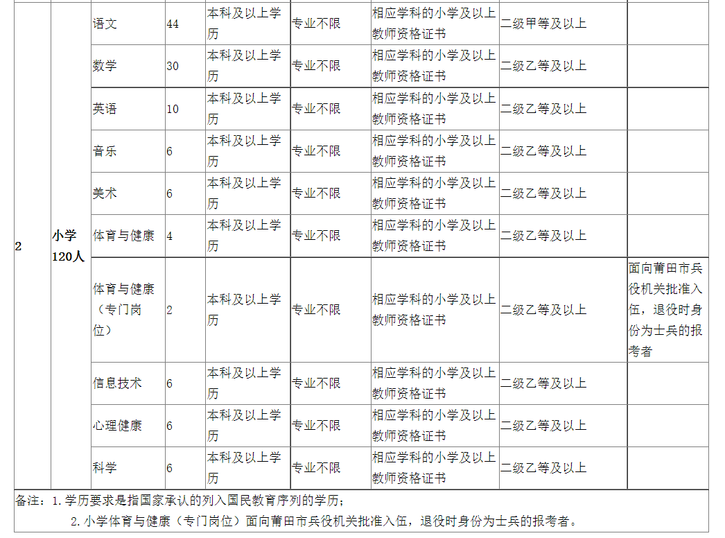 為進一步優(yōu)化我縣教師隊伍結構,推進新課程改革,促進教育均衡發(fā)展,根據(jù)省教育廳、省委編辦、省財政廳、省人社廳《關于進一步做好全省中小學幼兒園教師補充工作的若干措施》(閩教規(guī)〔2022〕3號)、省教育廳、省人社廳《關于2024年全省中小學幼兒園教師公開招聘筆試服務工作的通知》(閩教師〔2024〕2號)和莆田市退役軍人事務局、莆田市教育局、莆田市人力資源和社會保障局《關于轉發(fā)《福建省促進優(yōu)秀退役軍人到中小學任教九條措施》的通知》(莆退役軍人局〔2023〕49號)精神,結合我縣教師隊伍實際情況,現(xiàn)制定2024年中小學教師公開招聘方案公告如下: