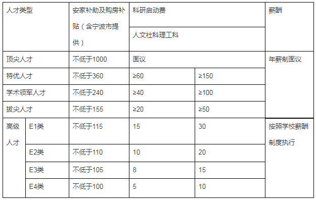?。ǘ┨峁╅L三角地區(qū)具有行業(yè)競爭力的薪酬待遇;根據(jù)個人情況可獲得寧波市安家費、購房補貼和學(xué)校提供的購房補貼、科研啟動費等,總額不低于100萬元,詳見《高層次人才引進待遇表》;對于緊缺學(xué)科或特別情況的,待遇可面議。待遇均為稅前,扣稅政策按寧波市有關(guān)規(guī)定執(zhí)行。