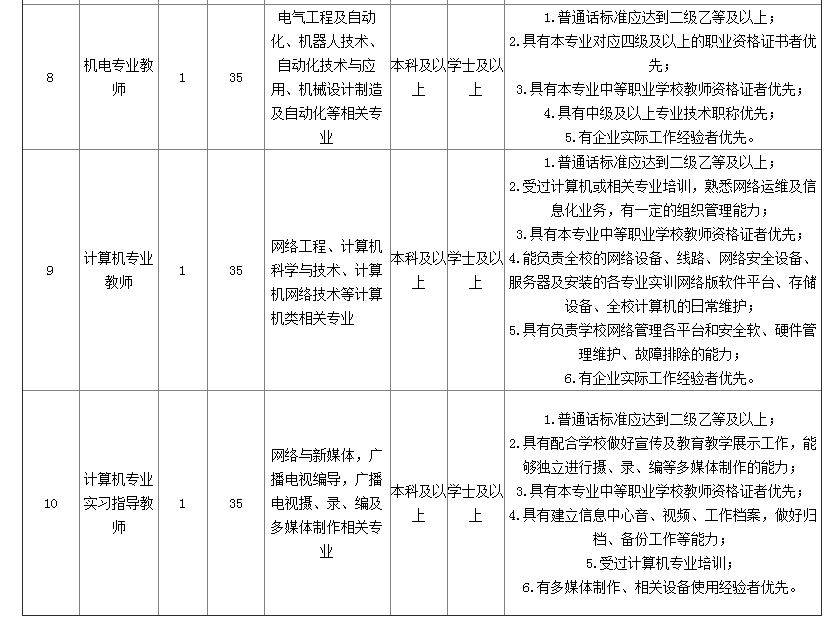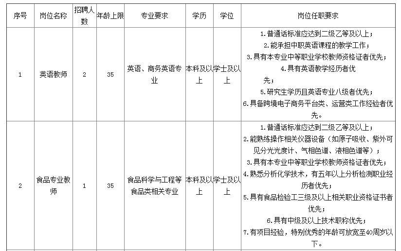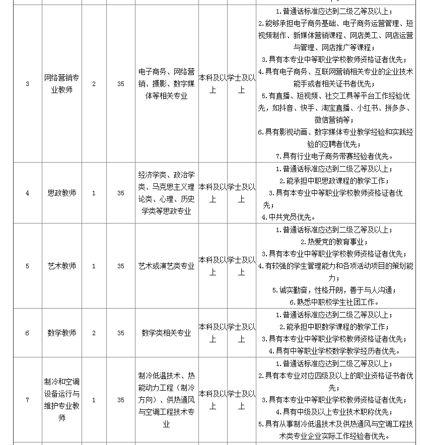 英語(yǔ)教師、食品專業(yè)教師、網(wǎng)絡(luò)營(yíng)銷專業(yè)教師、思政教師、藝術(shù)老師、數(shù)學(xué)教師、制冷和空調(diào)設(shè)備運(yùn)行與維護(hù)專業(yè)教師、機(jī)電專業(yè)教師、計(jì)算機(jī)專業(yè)教師、計(jì)算機(jī)專業(yè)實(shí)習(xí)指導(dǎo)教師等崗位采取筆試、面試和考察的方式。