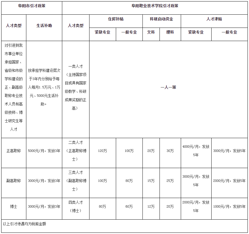 對(duì)于引進(jìn)的高層次人才,按照阜陽(yáng)市和學(xué)校引才政策提供住房補(bǔ)貼、科研啟動(dòng)費(fèi)、人才津貼、生活補(bǔ)助等,具體見表2。