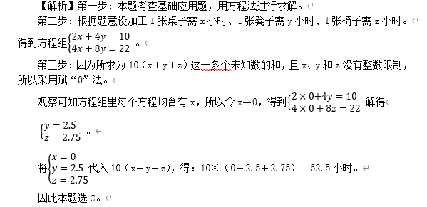 【例】木匠加工2張桌子和4張凳子共需要10個(gè)小時(shí),加工4張桌子和8張椅子需要22個(gè)小時(shí)。問如果他加工桌子、凳子和椅子各10張,共需要多少小時(shí)( )?
