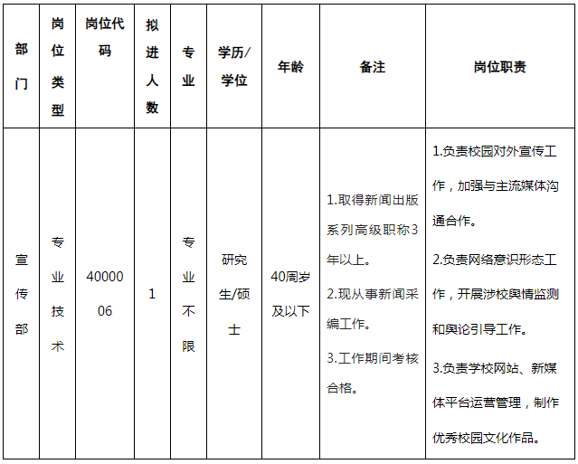 1.擁護中國共產(chǎn)黨的領(lǐng)導(dǎo),熱愛祖國,熱愛宣傳思想文化工作,熟悉高等教育事業(yè)發(fā)展規(guī)律,遵紀守法,具備良好的思想政治素質(zhì)和職業(yè)道德,具有扎實的專業(yè)知識、較強的團隊合作精神,身體健康。