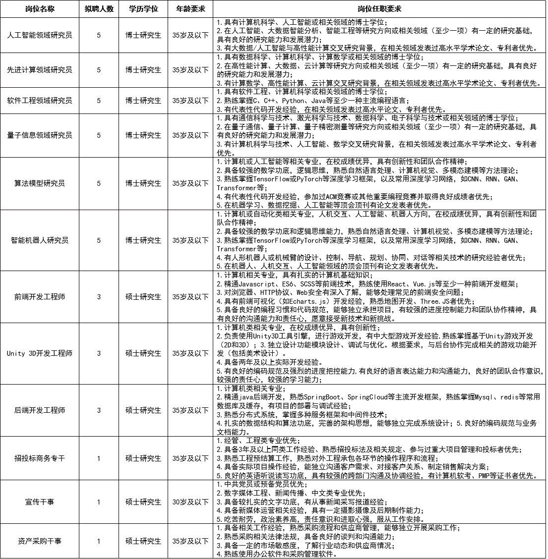 招聘崗位、計劃及要求