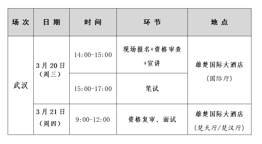 資格復審和面試地點:雄楚國際大酒店--楚天廳/楚漢廳(湖北省武漢市洪山區(qū)雄楚大街335號)