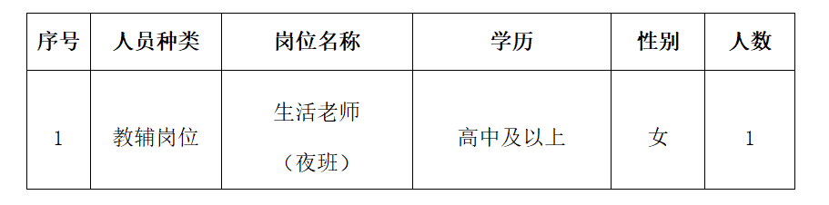 因?qū)W校實際用人需求,現(xiàn)招聘生活老師1名(女、夜班)。