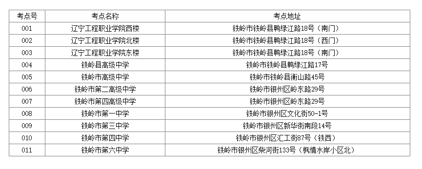 ※特別提示:因本次考試鐵嶺考區(qū)共設(shè)置11個考點,為防止走錯考點,請應(yīng)試人員注意區(qū)分以下考點名稱:“遼寧工程職業(yè)學(xué)院西樓”、“遼寧工程職業(yè)學(xué)院北樓”、“遼寧工程職業(yè)學(xué)院東樓”;“鐵嶺縣高級中學(xué)”、“鐵嶺市高級中學(xué)”;“鐵嶺市第四高級中學(xué)”、“鐵嶺市第四中學(xué)”。