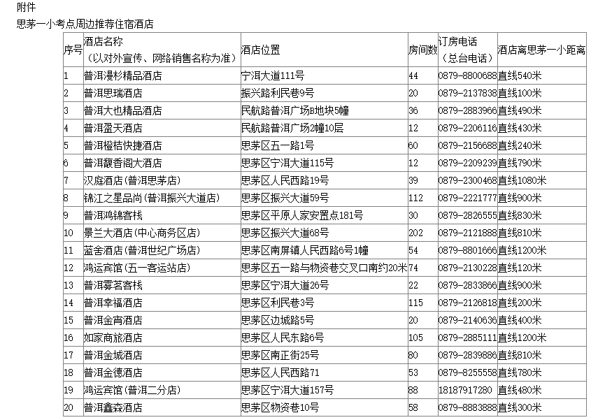 附件:思茅一小考點周邊推薦住宿酒店