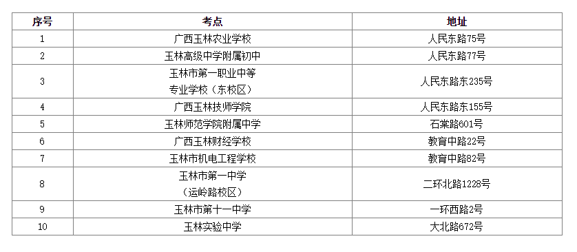請(qǐng)及時(shí)登錄“廣西人事考試網(wǎng)”打印筆試準(zhǔn)考證并妥善保管,仔細(xì)查看準(zhǔn)考證上的考點(diǎn)信息。本次考試玉林考區(qū)共設(shè)10個(gè)考點(diǎn),各考點(diǎn)名稱(chēng)、考點(diǎn)詳細(xì)地址如下: