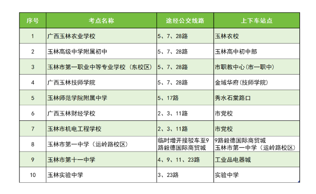 9路毅德國(guó)際商貿(mào)城站點(diǎn)7:30-9:00,13:00-14:00 在站點(diǎn)安排車(chē)輛和值勤人員,負(fù)責(zé)將考生送到玉林市第一中學(xué)(運(yùn)嶺路校區(qū))考點(diǎn)。